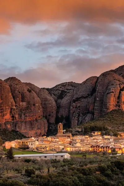 Pdac70 (rf) village of agüero beneath the conglomerate rock formations of the mallos de riglos, huesca province, aragon, spain. Aguero, province of huesca, aragon, spain. Its postal code is 22808. Aguero village with mallets of aguero at sunrise. In fact, the town and the rocks are a great landscape, where seems that the town is framed by rocks.